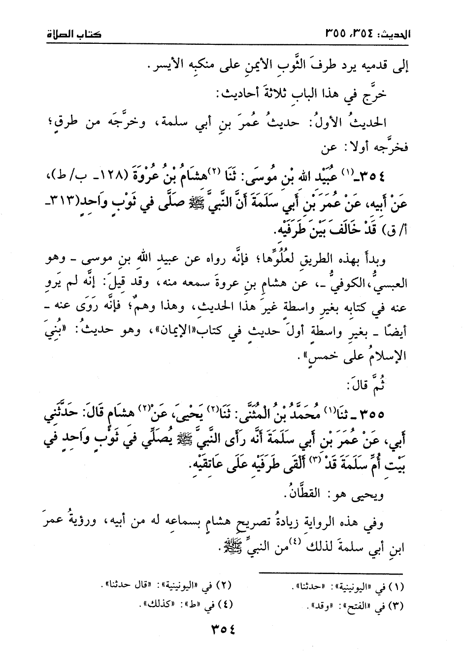 355 - ثنا محمد بن المثنى: ثنا يحيى، عن هشام، قال: حدثني أبي، عن عمر ابن أبي سلمة، أنه رأى النبي - صَلَّى اللهُ عَلَيْهِ وَسَلَّمَ - يصلي في ثوب واحد في بيت أم سلمة، قد ألقى طرفيه على عاتقيه.