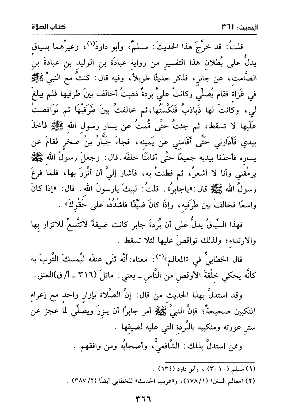 قلت: قد خرج هذا الحديث مسلم وأبو داود وغيرهما بسياق يدل على بطلان هذا التفسير، من رواية عبادة بن الوليد بن عبادة بن الصامت، عن جابر، فذكر حديثا طويلا، وفيه: قال: كنت مع النبي - صَلَّى اللهُ عَلَيْهِ وَسَلَّمَ - في غزاة، فقام يصلي، وكانت علي بردة ذهبت أخالف بين طرفيها، فلم يبلغ لي، وكانت لها ذباذب فنكستها، ثم خالفت بين طرفيها، ثم تواقصت عليها لا تسقط، ثم جئت حتى قمت عن يسار رسول الله - صَلَّى اللهُ عَلَيْهِ وَسَلَّمَ -، فأخذ بيدي فأدارني حتى أقامني عن يمينه، فجاء جبار بن صخر فقام عن يساره، فأخذنا بيديه جميعا حتى أقامنا خلفه. قال: وجعل رسول الله - صَلَّى اللهُ عَلَيْهِ وَسَلَّمَ - يرمقني وأنا لا أشعر، ثم فطنت به، فأشار إلي أن أتزر بها فلما فرغ رسول الله - صَلَّى اللهُ عَلَيْهِ وَسَلَّمَ - قال: ((يا جابر)) قلت: لبيك