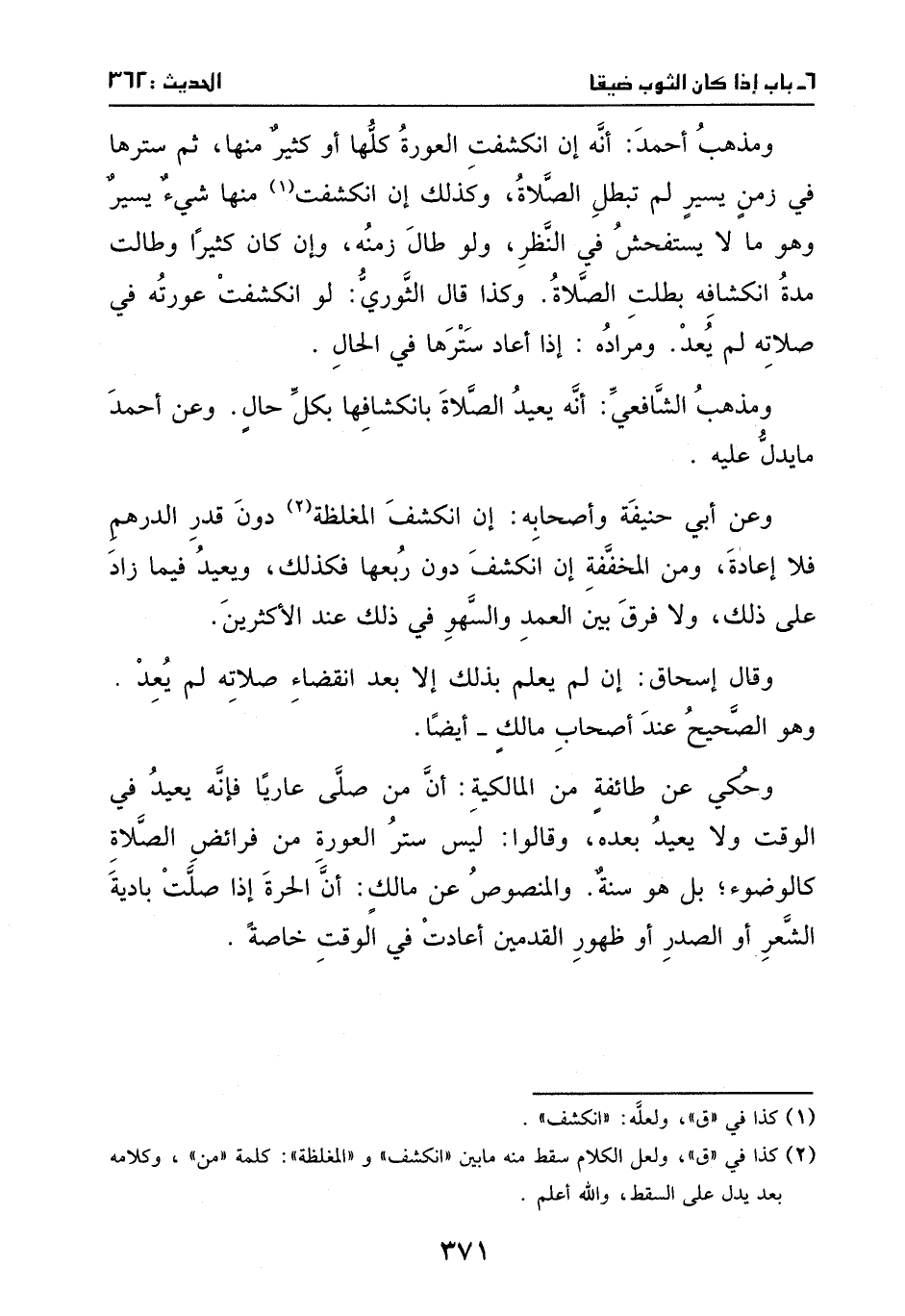 ومذهب أحمد: أنه إذا انكشفت العورة كلها أو كثير منها، ثم سترها في زمن يسير لم تبطل الصلاة؛ وكذلك أن انكشفت منها شيء يسير، وهو ما لا يستفحش في النظر ولو طال زمنه، وإن كان كثيرا وطالت مدة انكشافه بطلت الصلاة.