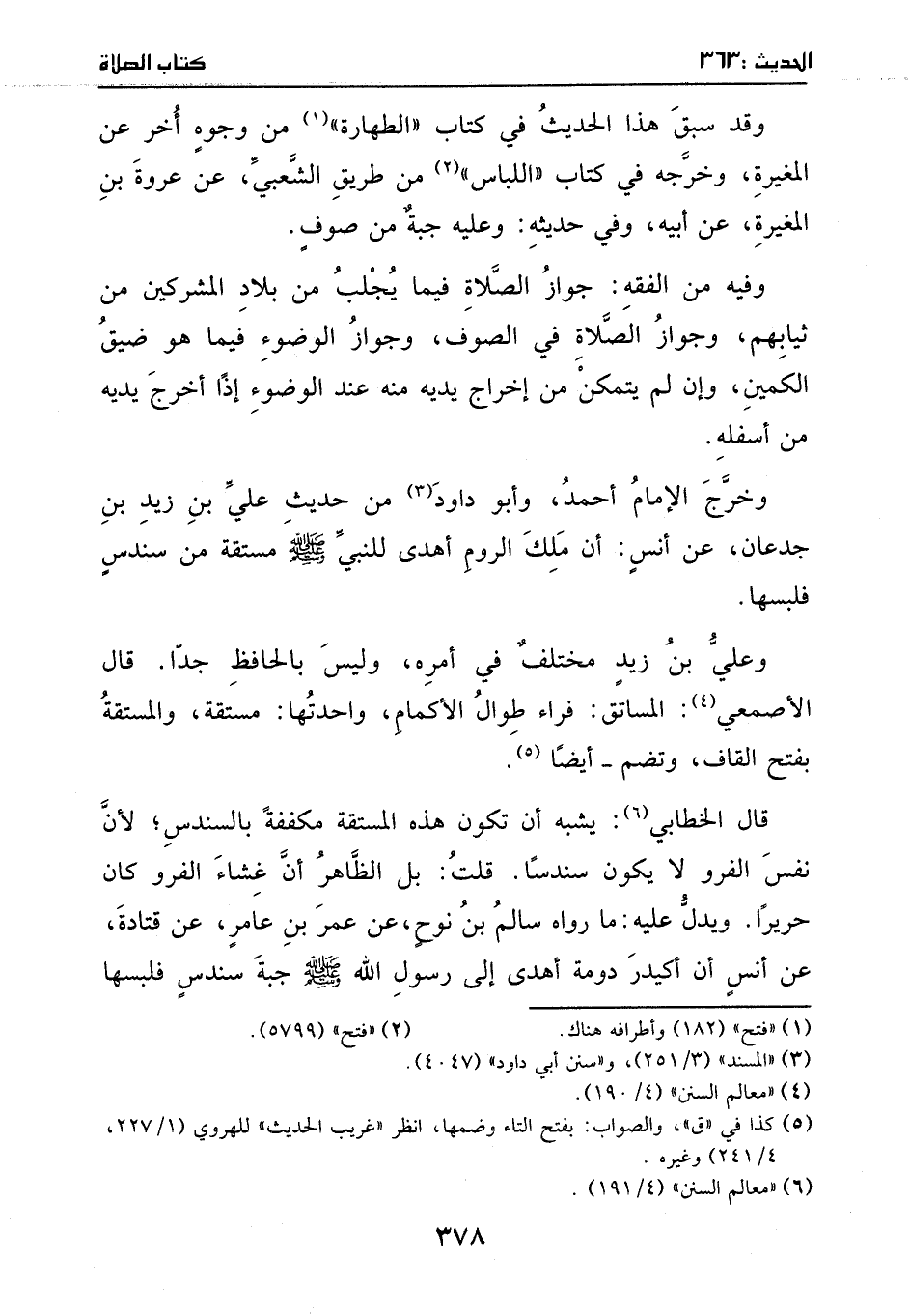 قلت: بل الظاهر أن غشاء الفرو كان حريرا، ويدل عليه: ما رواه سالم بن نوح، عن عمر بن عامر، عن قتادة، عن أنس: أن أكيدر دومة أهدى إلى رسول الله - صَلَّى اللهُ عَلَيْهِ وَسَلَّمَ - جبة سندس، فلبسها