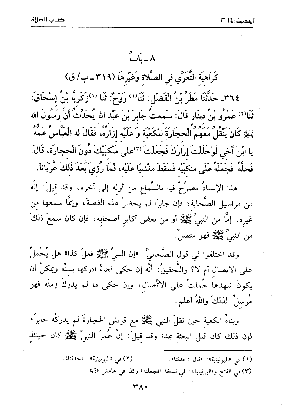 364 - حدثنا مطر بن الفضل: ثنا روح: ثنا زكريا بن إسحاق: ثنا عمرو بن دينار، قال: سمعت جابر بن عبد الله يحدث، أن رسول الله - صَلَّى اللهُ عَلَيْهِ وَسَلَّمَ - كان ينقل معهم الحجارة للكعبة وعليه إزاره، فقال له العباس عمه: يا بن أخي، لو حللت إزارك فجعلته على منكبيك دون الحجارة. قال: فحله، فجعله على منكبيه، فسقط مغشيا عليه، فما رئي بعد ذلك عريانا.