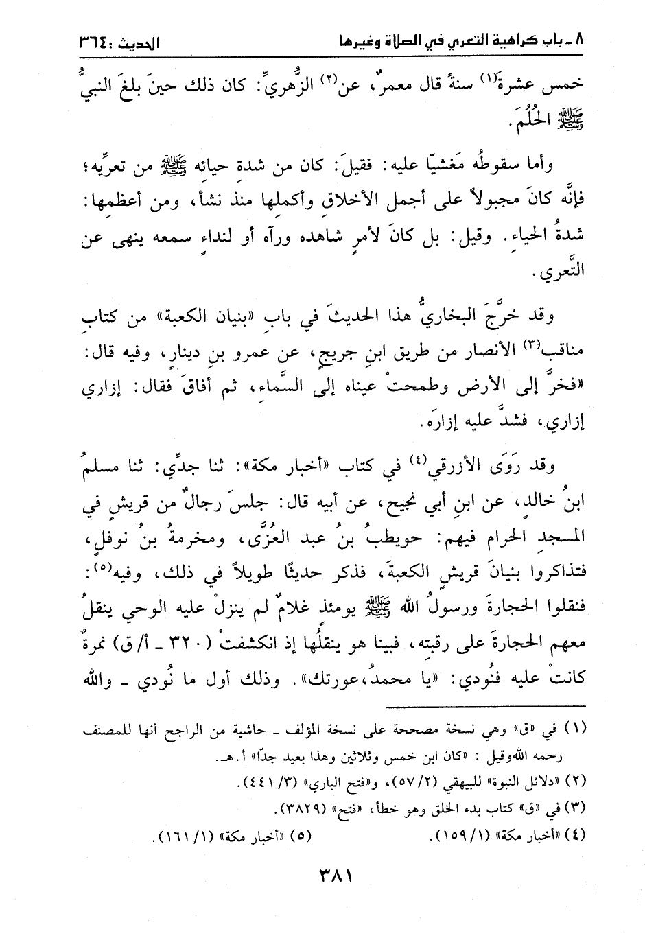 وقد روى الأزرقي في ((كتاب: أخبار مكة)) . ثنا جدي: ثنا مسلم بن خالد، عن ابن أبي نجيح، عن أبيه، قال: جلس رجال من قريش في المسجد الحرام، فيهم حويطب بن عبد العزى ومخرمة بن نوفل، فتذاكروا بنيان قريش الكعبة - فذكر حديثا طويلا في ذلك -، وفيه: فنقلوا الحجارة، ورسول الله - صَلَّى اللهُ عَلَيْهِ وَسَلَّمَ - يومئذ غلام لم ينزل عليه الوحي، ينقل معهم الحجارة على رقبته، فبينا هو ينقلها إذ انكشف نمرة كانت عليه، فنودي: يا محمد، عورتك، وذلك أول ما نودي - والله