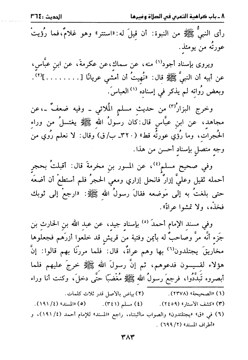 وفي ((مسند الإمام أحمد)) بإسناد جيد، عن عبد الله بن الحارث بن جزء، أنه مر وصاحب له بأيمن وفتية من قريش قد خلعوا أزرهم، فجعلوها مخاريق يجتلدون بها وهم عراة، قال: فلما مررنا بهم قالوا: أن هؤلاء لقسيسون، فدعوهم أن رسول الله - صَلَّى اللهُ عَلَيْهِ وَسَلَّمَ -، خرج عليهم، فلما أبصروه تبددوا، فرجع رسول الله - صَلَّى اللهُ عَلَيْهِ وَسَلَّمَ - مغضبا حتى دخل، وكنت أنا وراء