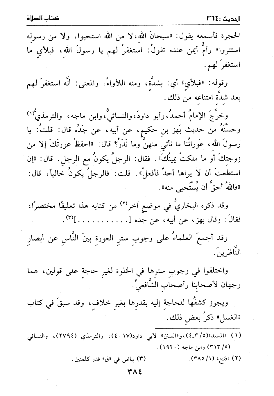 وخرج الأمام أحمد وأبو داود والنسائي وأبن ماجه والترمذي ـ وحسنه ـ من حديث بهز بن حكيم، عن أبيه، عن جده، قال: قلت: يا رسول الله، عوراتنا ما نأتي منهن وما نذر؟ قال: ((أحفظ عورتك إلا من زوجتك، وما ملكت يمينك)) ، فقال: الرجل يكون مع الرجل؟ قال: ((أن استطعت أن لا يراها أحد فأفعل)) ، قلت: فالرجل يكون خاليا؟ قال: ((فالله أحق أن يستحيا منه)) .