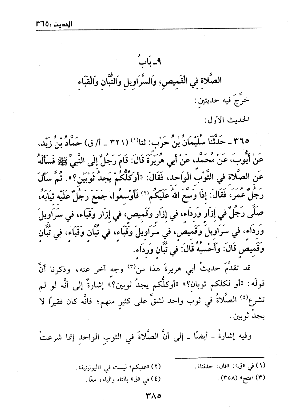 365 ـ حدثنا سليمان بن حرب: ثنا حماد بن زيد، عن أيوب، عن محمد، عن أبي هريرة، قال: قام رجل إلى النبي - صَلَّى اللهُ عَلَيْهِ وَسَلَّمَ - فسأله عن الصلاة في الثوب الواحد، فقال: ((أو كلكم يجد ثوبين؟)) ثم سأل رجل عمر، فقال: إذا وسع الله عليكم فأوسعوا، جمع رجل عليه ثيابه، صلى رجل في إزار ورداء، في إزار وقميص، في إزار وقباء، في سراويل ورداء، في سراويل وقميص، في سراويل وقباء، في تبان وقباء، في تبان وقميص. قال: وأحسبه قال: في تبان ورداء.