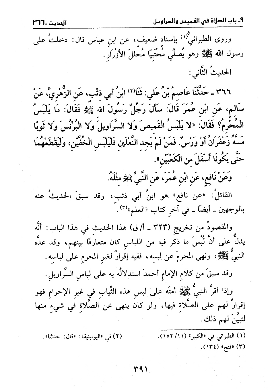 366 - حدثنا عاصم بن علي: ثنا ابن أبي ذئب، عن الزهري، عن سالم، عن ابن عمر، قال: سأل رجل رسول الله - صَلَّى اللهُ عَلَيْهِ وَسَلَّمَ -، فقال: ما يلبس المحرم؟ فقال: ((لا يلبس القميص، ولا السراويل، ولا البرنس، ولا ثوبا مسه زعفران أو ورس، فمن لم يجد النعلين فليلبس الخفين، وليقطعهما حتى يكونا أسفل من الكعبين)) .