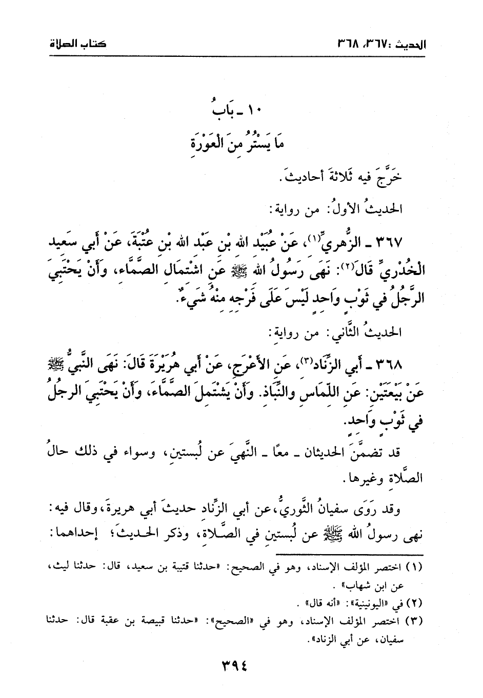 368 - من رواية: أبي الزناد، عن الأعرج، عن أبي هريرة، قال: نهى النبي - صَلَّى اللهُ عَلَيْهِ وَسَلَّمَ - عن بيعتين: عن اللماس والنباذ، وان يشتمل الصماء، وان يحتبي الرجل في ثوب واحد.