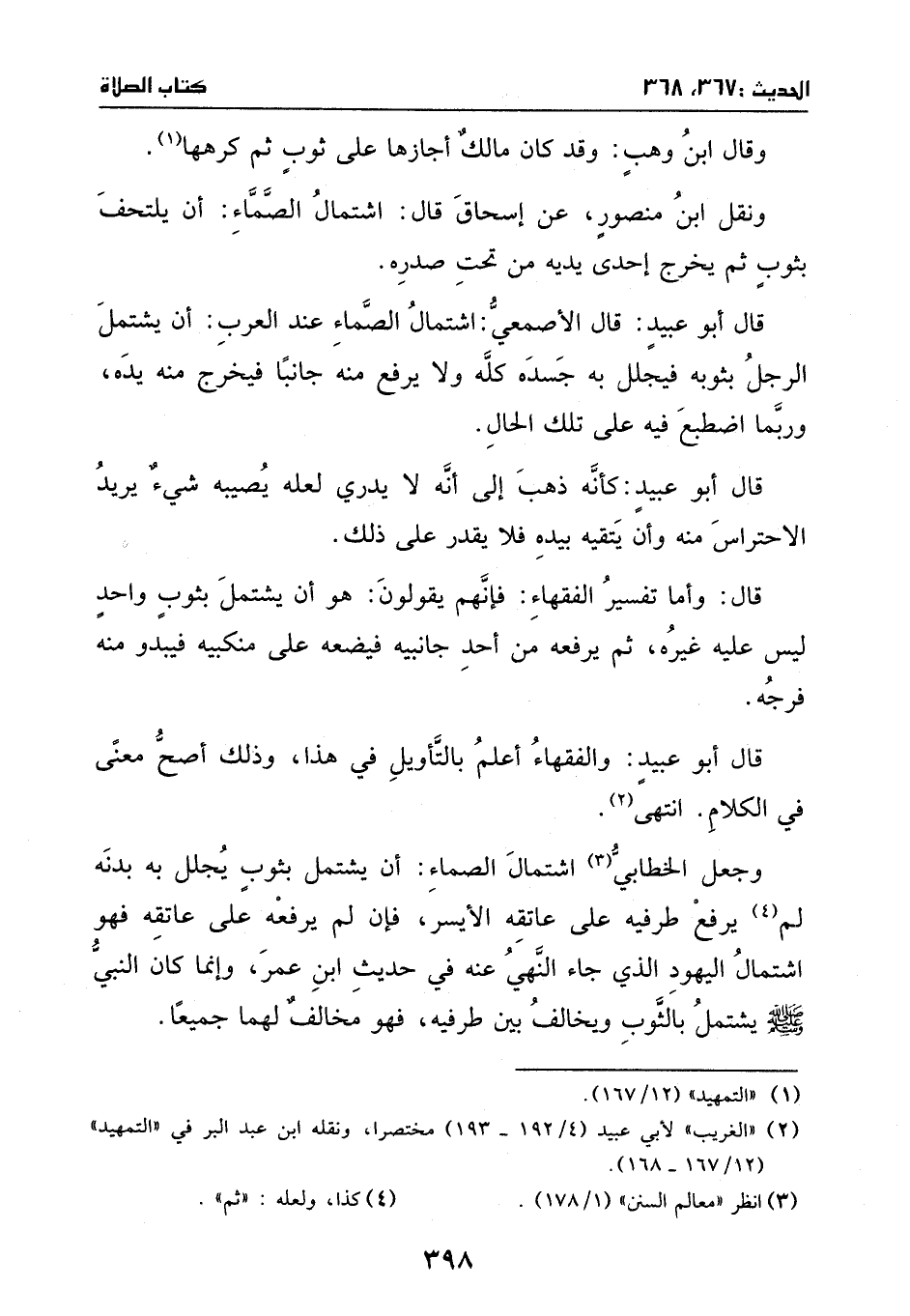 قال: وأما تفسير الفقهاء؛ فإنهم يقولون: هو أن يشتمل بثوب واحد ليس عليه غيره، ثم يرفعه من احد جانبيه، فيضعه على منكبيه فيبدو منه فرجه.