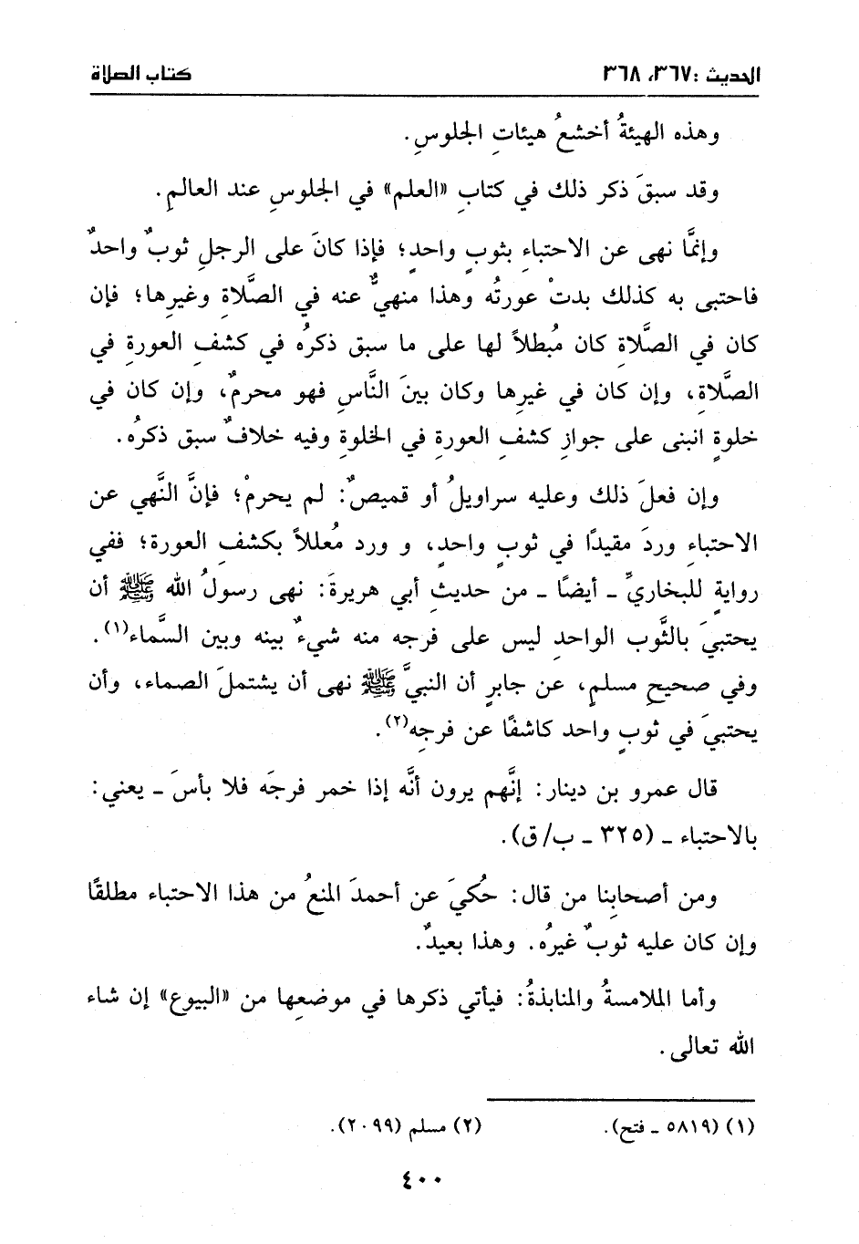 وفي ((صحيح مسلم)) عن جابر، أن النبي - صَلَّى اللهُ عَلَيْهِ وَسَلَّمَ - نهى أن يشتمل الصماء، وان يحتبي في ثوب واحد، كاشفا عن فرجه.