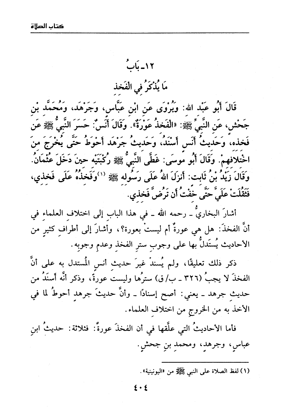 أشار البخاري - رحمه الله - في هذا الباب إلى اختلاف العلماء في أن الفخذ: هل هي عورة، أم ليست بعورة؟ وأشار إلى أطراف كثير من الأحاديث التي يستدل بها على وجوب ستر الفخذ، وعدم وجوبه، ذكر ذلك تعليقا، ولم يسند غير حديث أنس المستدل به على أن الفخذ لا يجب سترها وليست عورة، وذكر أنه أسند من حديث جرهد - يعني: أصح إسنادا -؛ وان حديث جرهد أحوط؛ لما في الأخذ به من الخروج من اختلاف العلماء.