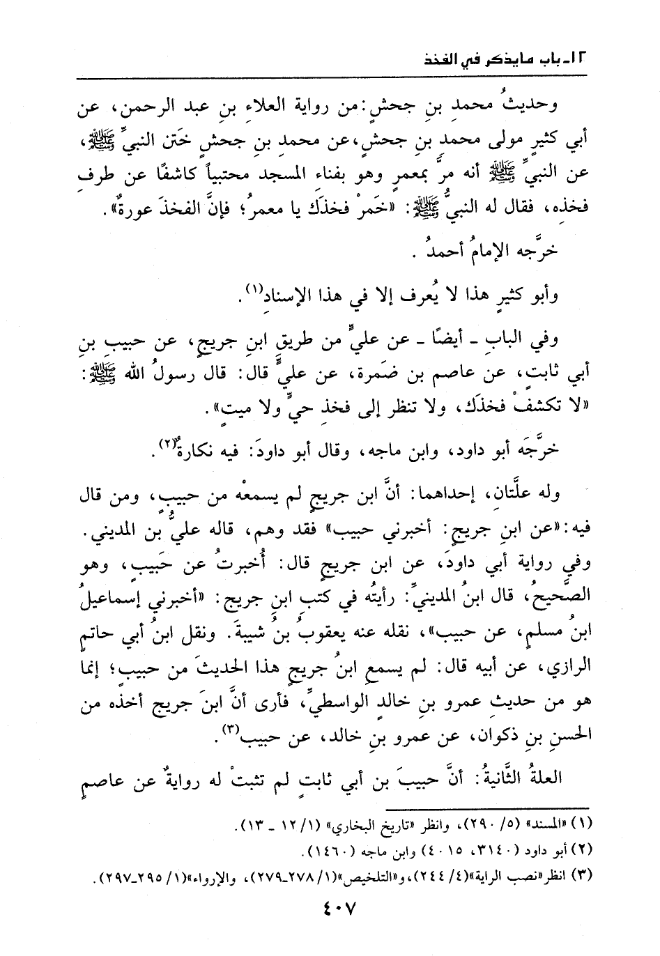 وحديث محمد بن جحش: من رواية العلا بن عبد الرحمان، عن أبي كثير مولى محمد بن جحش، عن محمد بن جحش - ختن النبي - صَلَّى اللهُ عَلَيْهِ وَسَلَّمَ -، عن النبي - صَلَّى اللهُ عَلَيْهِ وَسَلَّمَ -، أنه مر بمعمر وهو بفناء المسجد، محتبيا كاشفا عن طرف فخذه، فقال له النبي - صَلَّى اللهُ عَلَيْهِ وَسَلَّمَ - ((خمر فخذك يا معمر؛ فإن الفخذ عورة)) .