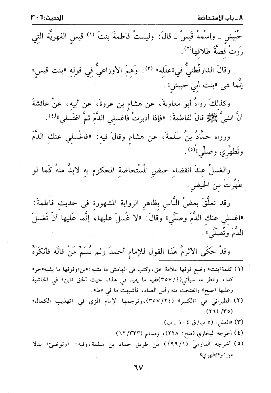 ورواه حماد بن سلمة، عن هشام، وقال فيهِ: ((فاغسلي عنك الدم، وتطهري، وصلي)) .