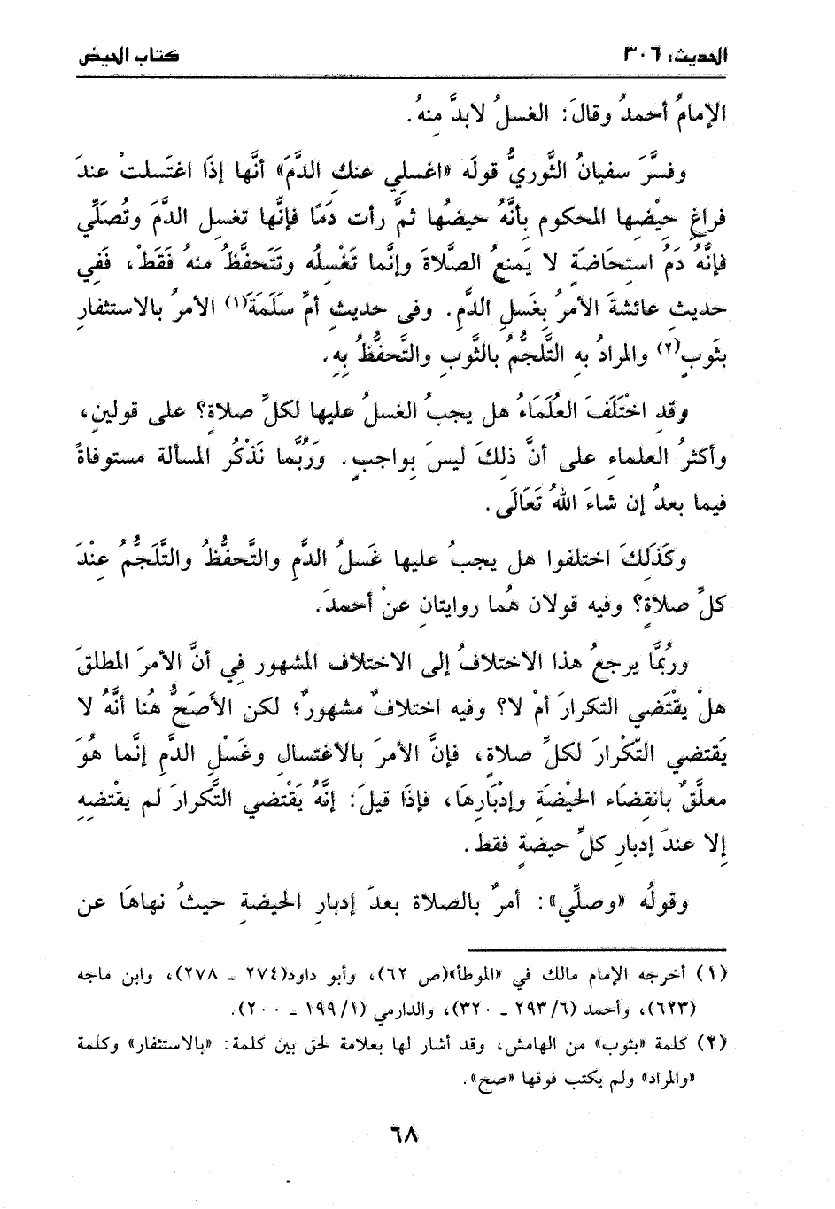 وكذلك اختلفوا: هل يجب عليها غسل الدم والتحفظ والتلجم عندَ كل صلاة؟ وفيه قولان، هما روايتان عن أحمد.