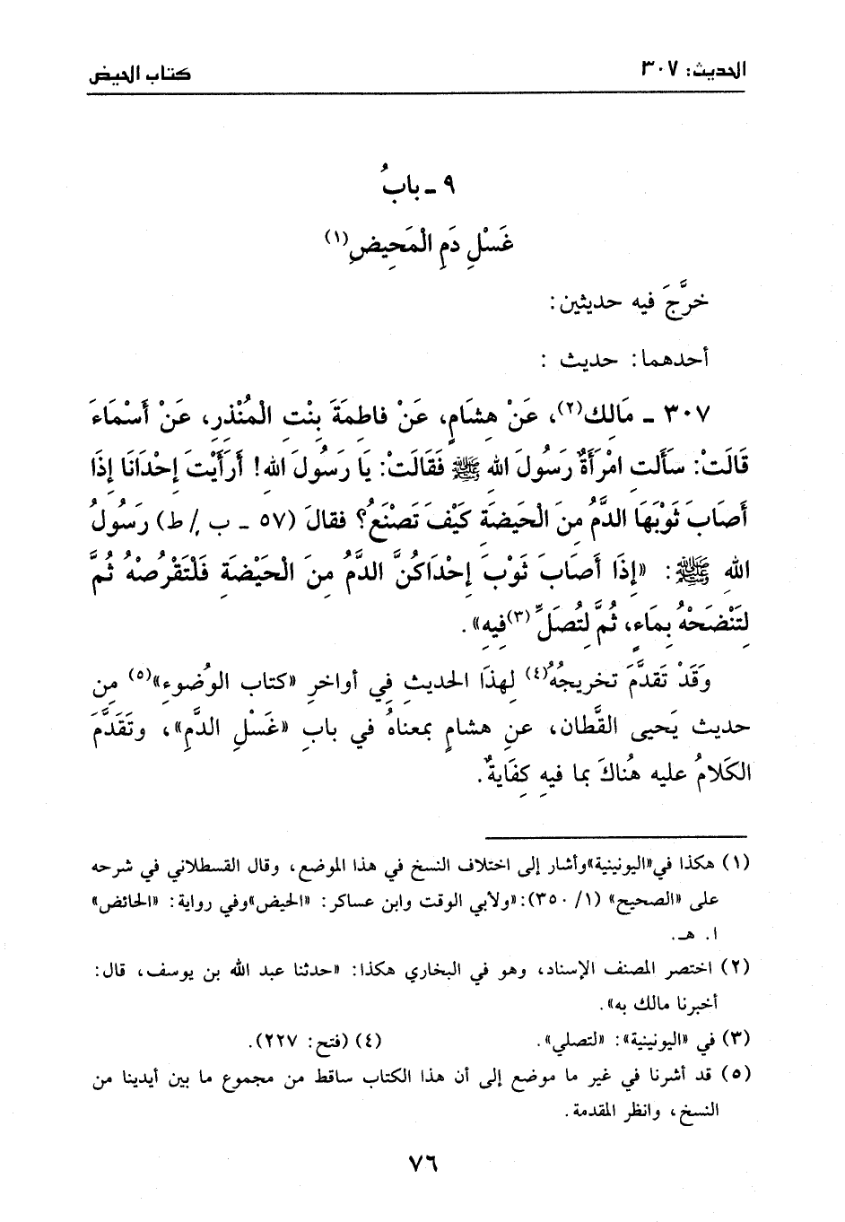 307 - حديث: مالك، عَن هشام، عَن فاطمة بنت المنذر، عَن أسماء، قالت: سألت امرأة رسول الله - صَلَّى اللهُ عَلَيْهِ وَسَلَّمَ -، فقالت: يا رسول الله، أرأيت إحدانا إذا أصاب ثوبها الدم مِن الحيضة، كيف تصنع؟ فقالَ رسول الله - صَلَّى اللهُ عَلَيْهِ وَسَلَّمَ -: ((إذا أصاب ثوب إحداكن الدم مِن الحيضة فلتقرصه، [ثُمَّ] لتنضحه بماء، ثُمَّ لتصلي فيهِ)) .