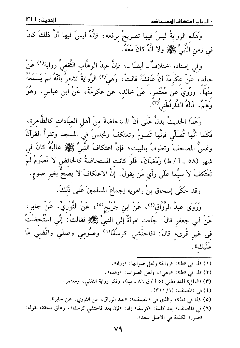 وهذا الحديث: يدل على أن المستحاضة مِن أهل العبادات كالطاهرة، فكما أنها تصلي فإنها تصوم، وتعتكف، وتجلس في المسجد، وتقرأ القرآن، وتمس المصحف، وتطوف بالبيت؛ فإن اعتكاف النبي - صَلَّى اللهُ عَلَيْهِ وَسَلَّمَ - غالبه كانَ في شهر رمضان، فلو كانت المستحاضة كالحائض لا تصوم لَم تعتكف، لا سيما على رأي مِن يقول: إن الاعتكاف لا يصح بغير صوم، وقد حكى إسحاق بن راهويه إجماع المسلمين على ذَلِكَ.