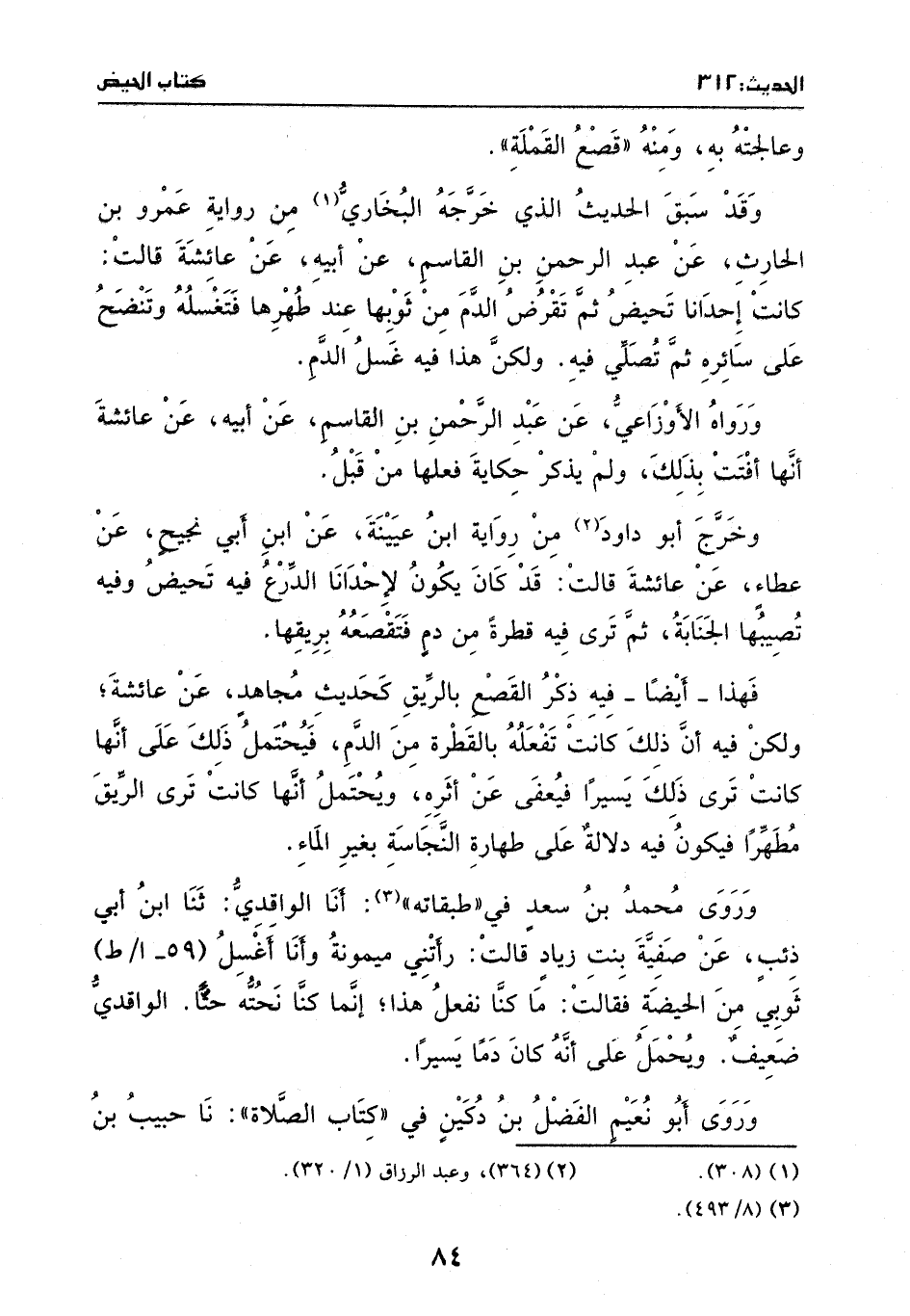 عائشة، قالت: قَد كانَ يكون لإحدانا الدرع، فيهِ تحيض، وفيه تصيبها الجنابة، ثُمَّ ترى فيهِ قطرة مِن دم فتقصعه بريقها.