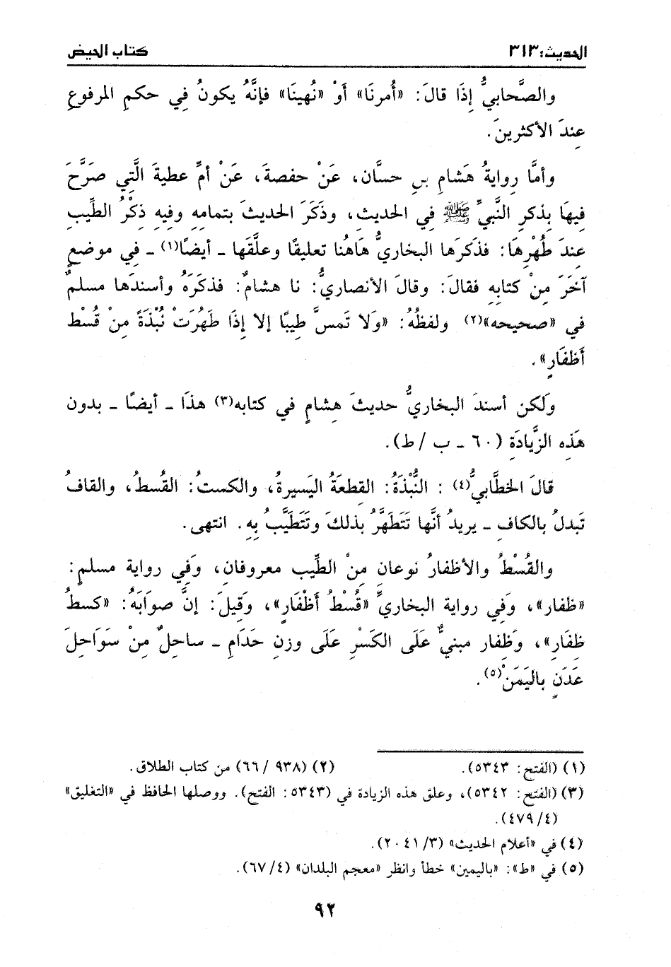 وأما رواية هشام بنِ حسان، عَن حفصة، عَن أم عطية، التي صرح فيها بذكر النبي - صَلَّى اللهُ عَلَيْهِ وَسَلَّمَ - في الحديث وذكر الحديث بتمامه، وفيه ذكر الطيب عند طهرها، فذكرها البخاري هاهنا تعليقاً، وعلقها - أيضاً - في موضع آخر مِن ((كتابه)) ، فقالَ: ((وقال الأنصاري: ثنا هشام)) - فذكره.