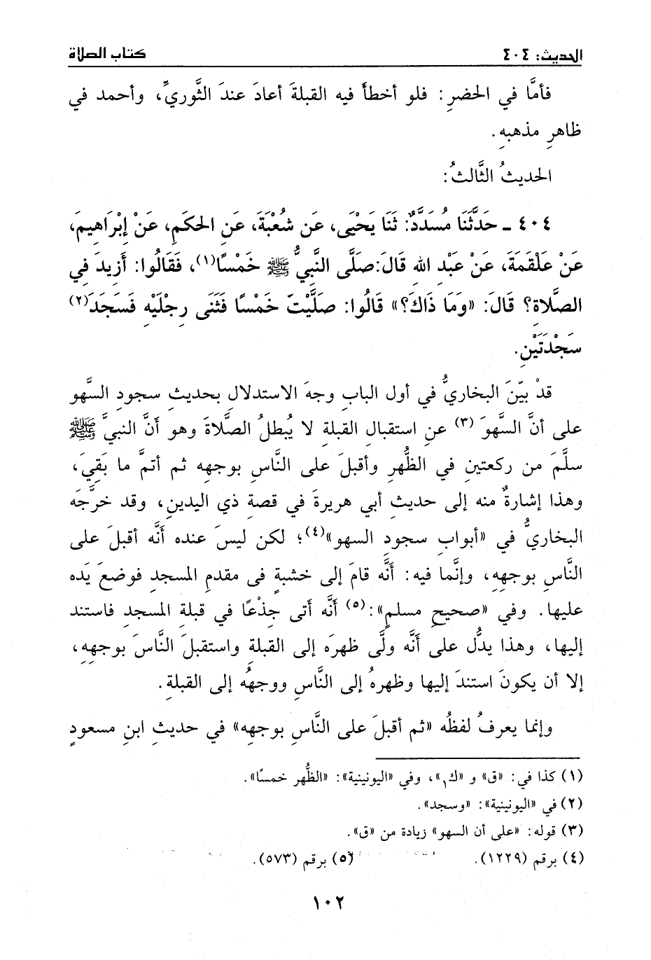 404 - حدثنا مسدد: ثنا يحيى، عن شعبة، عن الحكم، عن إبراهيم، عن علقمة، عن عبد الله، قال: صلى النبي - صَلَّى اللهُ عَلَيْهِ وَسَلَّمَ - الظهر خمسا، فقالوا: أزيد في الصلاة؟ قال: ((وما ذاك؟)) قالوا: صليت خمسا، فثنى رجليه، فسجد سجدتين.
