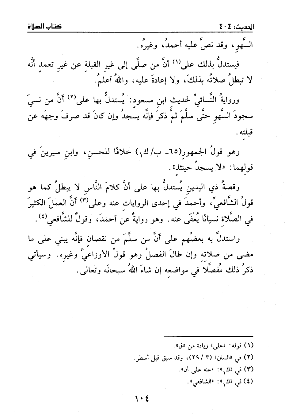 ورواية النسائي لحديث ابن مسعود يستدل بها على أن من نسي سجود السهو حتى سلم ثم ذكر فإنه يسجد، وأن كان قد صرف وجهه عن قبلته، وهو قول
