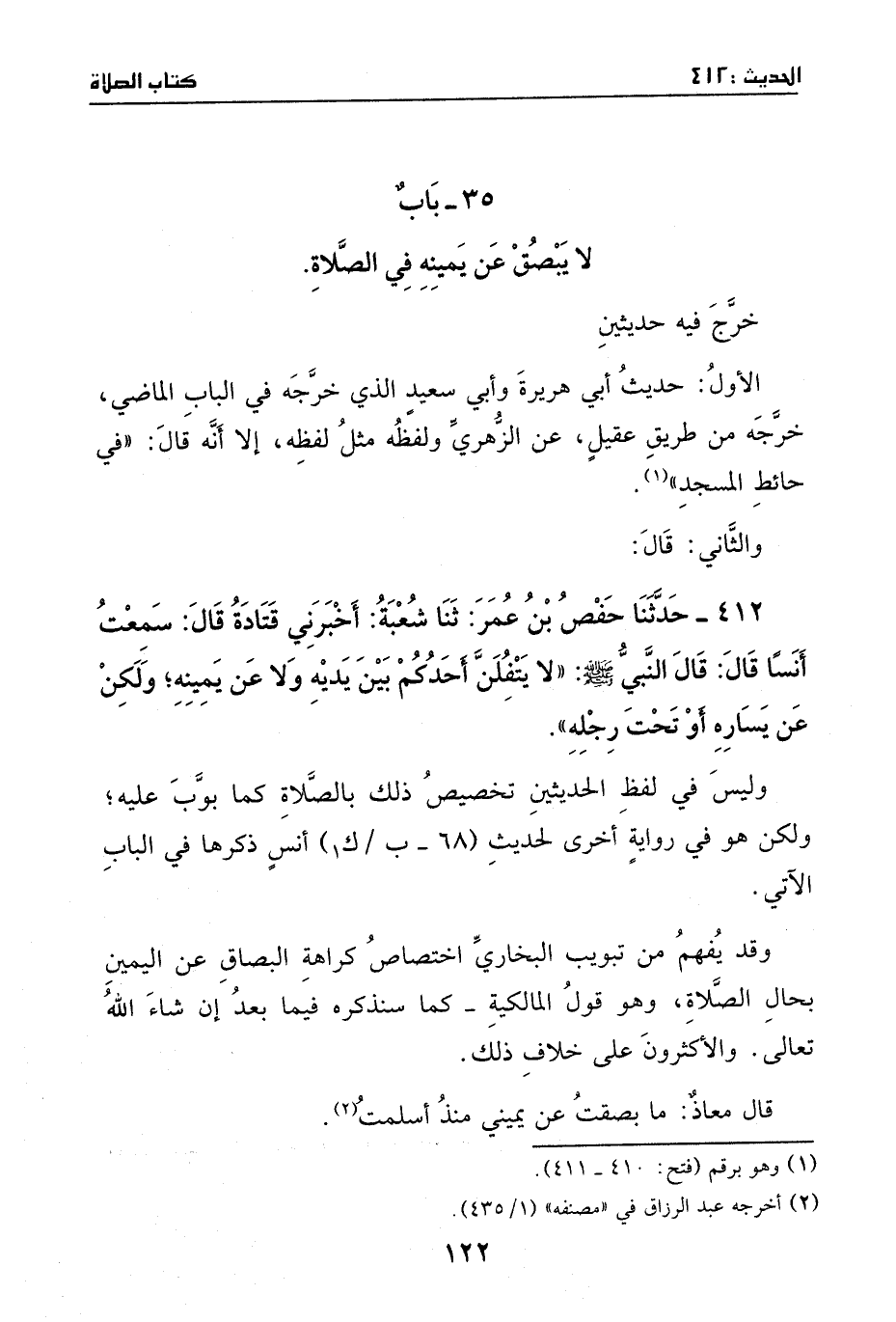 412 - ثنا حفص بن عمر: ثنا شعبة: أخبرني قتادة، قال: سمعت أنسا، قال: قال النبي - صَلَّى اللهُ عَلَيْهِ وَسَلَّمَ -: ((لا يتفلن أحدكم بين يديه، ولا عن يمينه، ولكن عن يساره، أو تحت رجله)) .