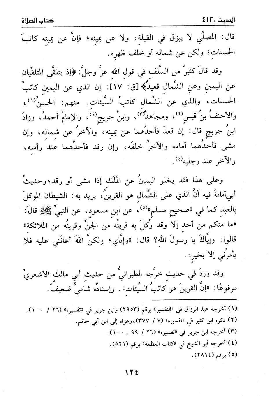 وقد قالَ كثير من السلف في قول الله عز وجل: {إِذْ يَتَلَقَّى الْمُتَلَقِّيَانِ عَنِ الْيَمِينِ وَعَنِ الشِّمَالِ قَعِيدٌ} [ق: 17] : أن الذي عن اليمين كاتب الحسنات، والذي عن الشمال كاتب السيئات، منهم: الحسن، والأحنف بن قيس، ومجاهد، وابن جريج، والإمام أحمد.