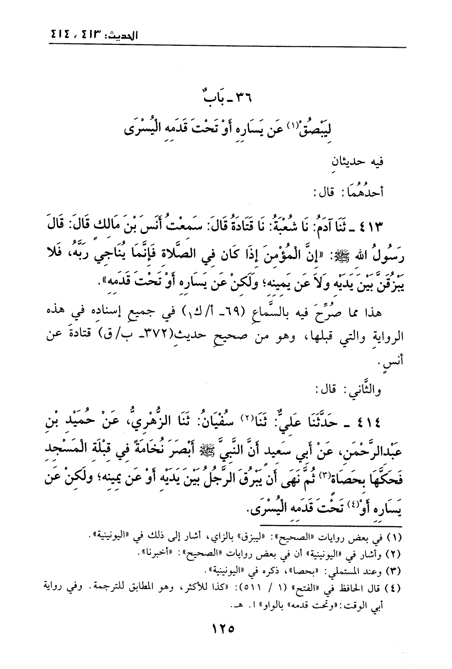 413 - ثنا آدم: ثنا شعبة: ثنا قتادة، قال سمعت أنس بن مالك، قالَ: قال رسول الله - صَلَّى اللهُ عَلَيْهِ وَسَلَّمَ - ((أن المؤمن إذا كان في الصلاة فإنما يناجي ربه، فلا يبزقن بين يديه ولا عن يمينه، ولكن عن يساره، أو تحت قدمه)) .