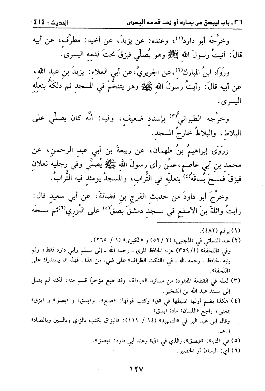 وروي إبراهيم بن طهمان، عن ربيعة بن أبي عبد الرحمان، عن محمد بن أبي عاصم، عمن رأى رسول الله - صَلَّى اللهُ عَلَيْهِ وَسَلَّمَ - يصلي وفي رجليه نعلان، فبزق فمسح بساقه بنعله في التراب، والمسجد يومئذ فيه التراب.