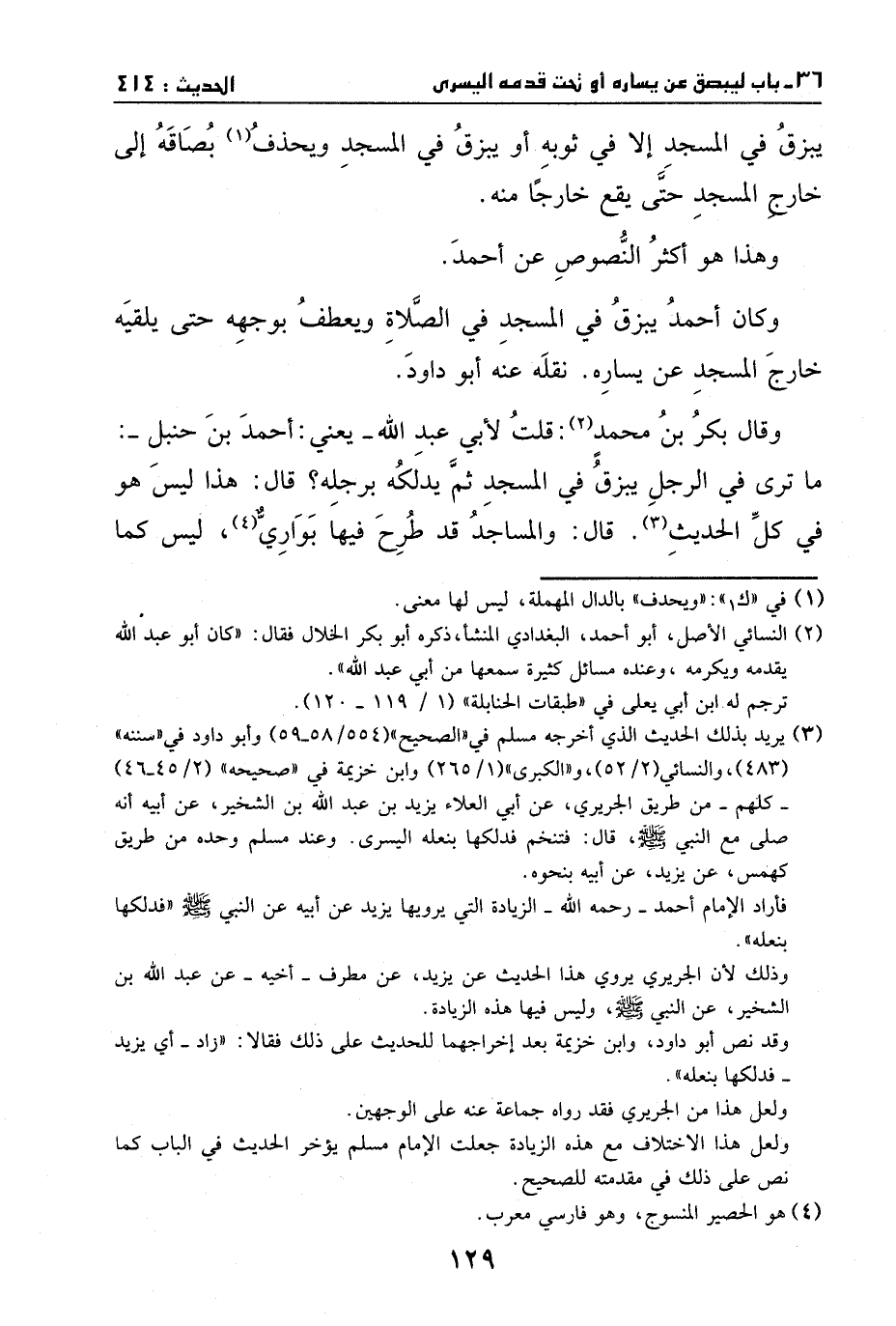 وقال بكر بن محمد: قلت لأبي عبد الله - يعني: أحمد بن حنبل -: ما ترى في الرجل يبزق في المسجد ثم يدلكه برجله؟ قال: هذا ليس هو في كل الحديث. قال: والمساجد قد طرح فيها بواري ليس كما
