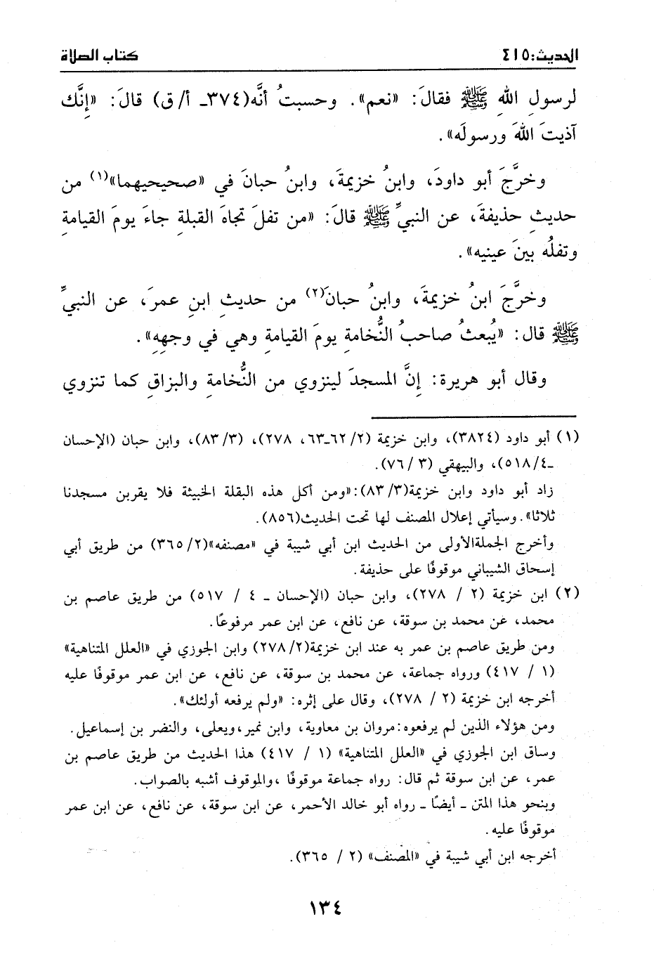 وخرج أبو داود وابن خزيمة وابن حبان في ((صحيحهما)) من حديث حذيفة، عن النبي - صَلَّى اللهُ عَلَيْهِ وَسَلَّمَ -، قال: ((من تفل تجاه القبلة جاء يوم القيامة وتفله بين عينيه)) .