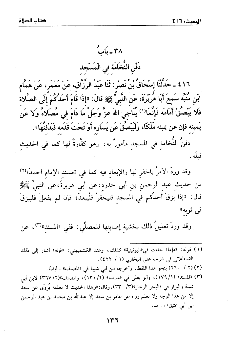 416 - حدثنا إسحاق بن نصر: أبنا عبد الرزاق، عن معمر، عن همام بن منبه: سمع أبا هريرة، عن النبي - صَلَّى اللهُ عَلَيْهِ وَسَلَّمَ -، قال: ((إذا قام أحدكم إلى الصلاة فلا يبصق أمامه؛ فإنما يناجي الله ما دام في مصلاه، ولا عن يمينه؛ فإن عن يمينه ملكا، وليبصق عن يساره أو تحت قدمه، فيدفنها)) .