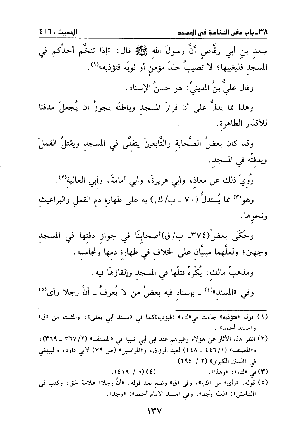 سعد ابن أبي وقاص، أن رسول الله - صَلَّى اللهُ عَلَيْهِ وَسَلَّمَ - قال: ((إذا تنخم أحدكم في المسجد فليبعدها، لا تصيب جلد مؤمن أو ثوبه فتؤذيه)) .