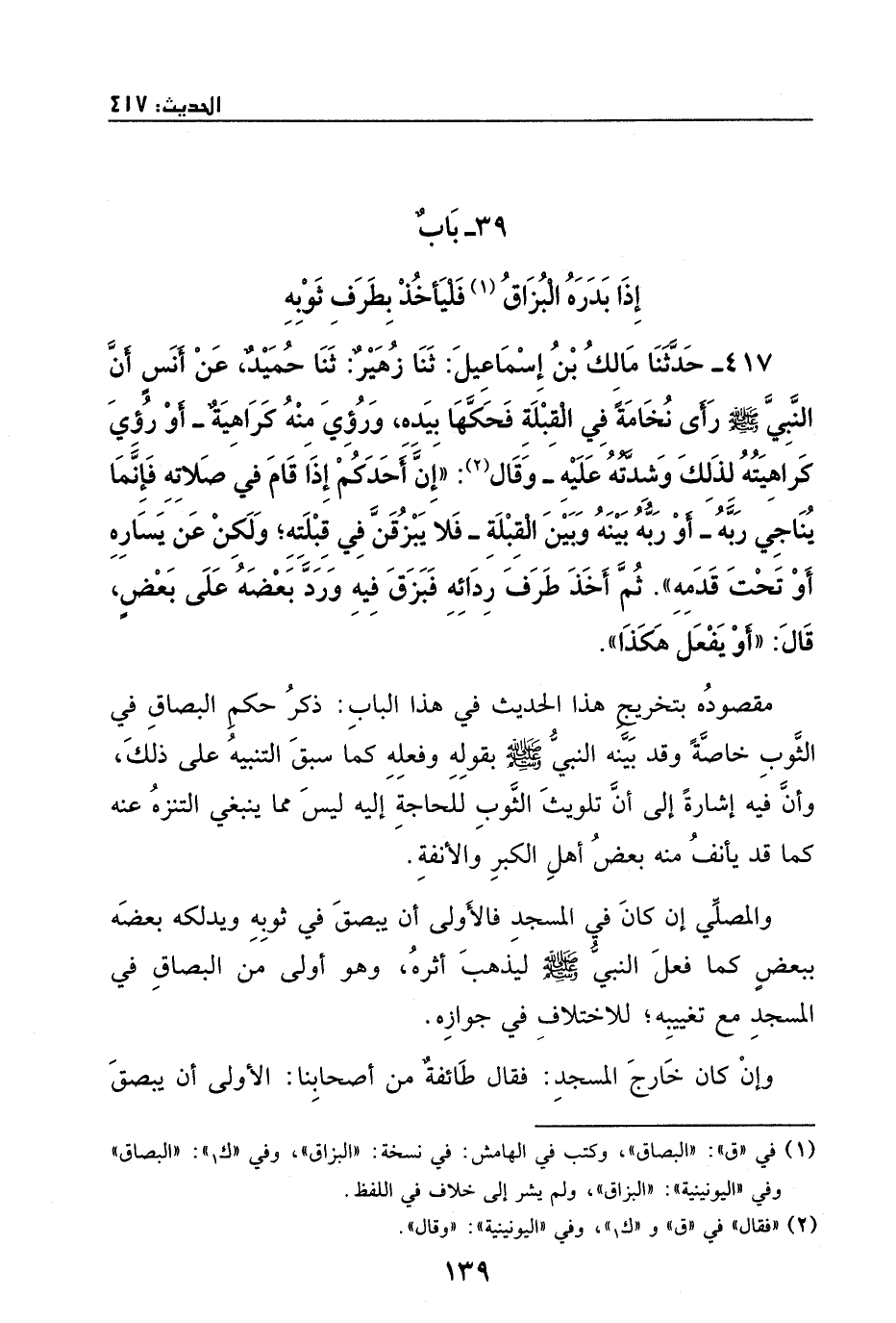 417 - حدثنا مالك بن إسماعيل: ثنا زهير: ثنا حُميد، عن أنس، أن النبي - صَلَّى اللهُ عَلَيْهِ وَسَلَّمَ - رأى نخامة في القبلة فحكها بيده، ورئي منه كراهية - أو رئي كراهية - لذلك وشدته عليه، فقال: ((إن أحدكم إذا قام في صلاته فإنما يناجي ربه - أو إن ربه بينه وبين القبلة -، فلا يبزقن في قبلته، ولكن عن يساره أو تحت قدمه)) ، ثم أخذ طرف ردائه فبزق فيه، ورد بعضه على بعض. قال: ((أو يفعل هكذا)) .