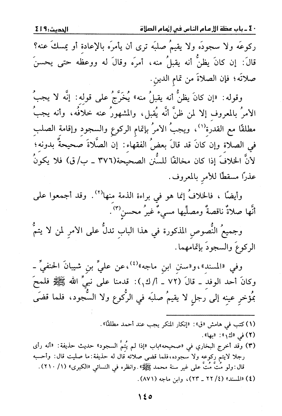 ويجب الأمر بإتمام الركوع والسجود وإقامة الصلب في الصلاة، وإن كان قد قال بعض الفقهاء: إن الصلاة صحيحة بدونه؛ لأن الخلاف إذا كان مخالفا للسنن الصحيحة فلا يكون عذرا مسقطا للأمر بالمعروف.
