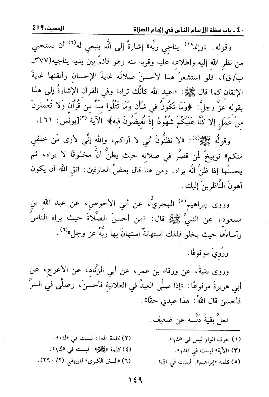 وروى إبراهيم الهجري، عن أبي الأحوص، عن عبد الله بن مسعود، عن النبي - صَلَّى اللهُ عَلَيْهِ وَسَلَّمَ -، قال: ((من أحسن الصلاة حيث يراه الناس، وأساءها حيث يخلو فذلك استهانة استهان بها ربه - عز وجل -)) .