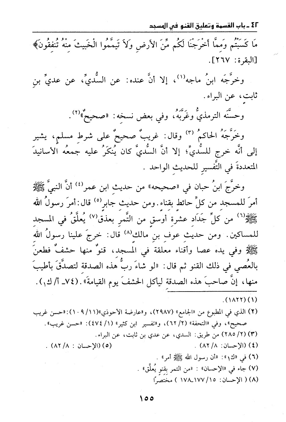 وخرج ابن حبان في ((صحيحه)) من حديث ابن عمر، أن النبي - صَلَّى اللهُ عَلَيْهِ وَسَلَّمَ - أمر للمسجد من كل حائط بقناء.