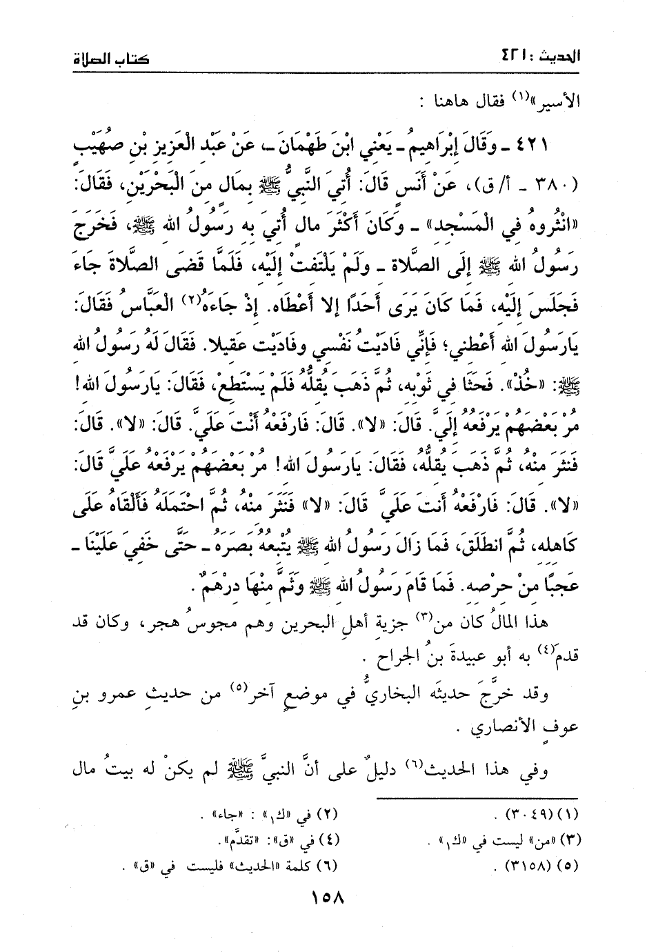 421 - وقال إبراهيم - يعني: ابن طهمان -: عن عبد العزيز بن صهيب، عن أنس، قال: أتي النبي - صَلَّى اللهُ عَلَيْهِ وَسَلَّمَ - بمال من البحرين، فقال: ((انثروه في المسجد)) - وكان أكثر مال أتي به رسول الله - صَلَّى اللهُ عَلَيْهِ وَسَلَّمَ -، فخرج رسول الله - صَلَّى اللهُ عَلَيْهِ وَسَلَّمَ - إلى الصلاة، ولم يلتفت إليه، فلما قضى الصلاة جاء فجلس إليه، فما كان يرى أحدا إلا أعطاه، إذ جاءه العباس، فقال: يا رسول الله، أعطني؛ فإني فاديت نفسي وفاديت عقيلا. فقال له رسول الله - صَلَّى اللهُ عَلَيْهِ وَسَلَّمَ -: ((خذ)) ، فحثا في ثوبه، ثم ذهب يقله فلم يستطع، فقال: يا رسول الله، مر بعضهم يرفعه إلي. قال: ((لا)) . قال: فارفعه أنت علي. قال: ((لا)) . قال: فنثر منه، ثم ذهب يقله. فقال: يا رسول الله، مر بعضهم يرفعه علي. قال: ((لا)) . قال: فارفعه أنت علي. قال: ((لا)) . فنثر منه، ثم احتمله، فألقاه على كاهله، ثم انطلق، فما زال رسول الله - صَلَّى اللهُ عَلَيْهِ وَسَلَّمَ - يتبعه بصره حتى خفي علينا؛ عجبا من حرصه. فما قام رسول الله - صَلَّى اللهُ عَلَيْهِ وَسَلَّمَ - وثم منها درهم.