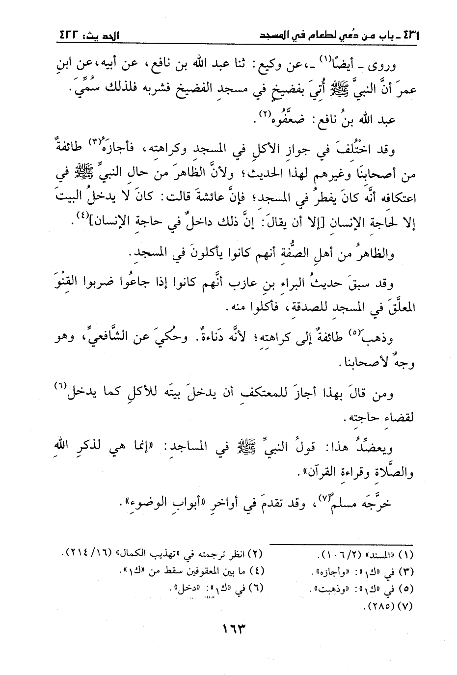وقد اختلف في جواز الأكل في المسجد وكراهته، فأجازه طائفة من أصحابنا وغيرهم؛ لهذا الحديث؛ ولان الظاهر من حال النَّبِيّ - صَلَّى اللهُ عَلَيْهِ وَسَلَّمَ - فِي اعتكافه أنه كَانَ يفطر فِي المسجد؛ فإن عائشة قالت: كان لا يدخل البيت إلا لحاجة الإنسان، إلا أن يقال: أن ذلك داخل في حاجة الإنسان.