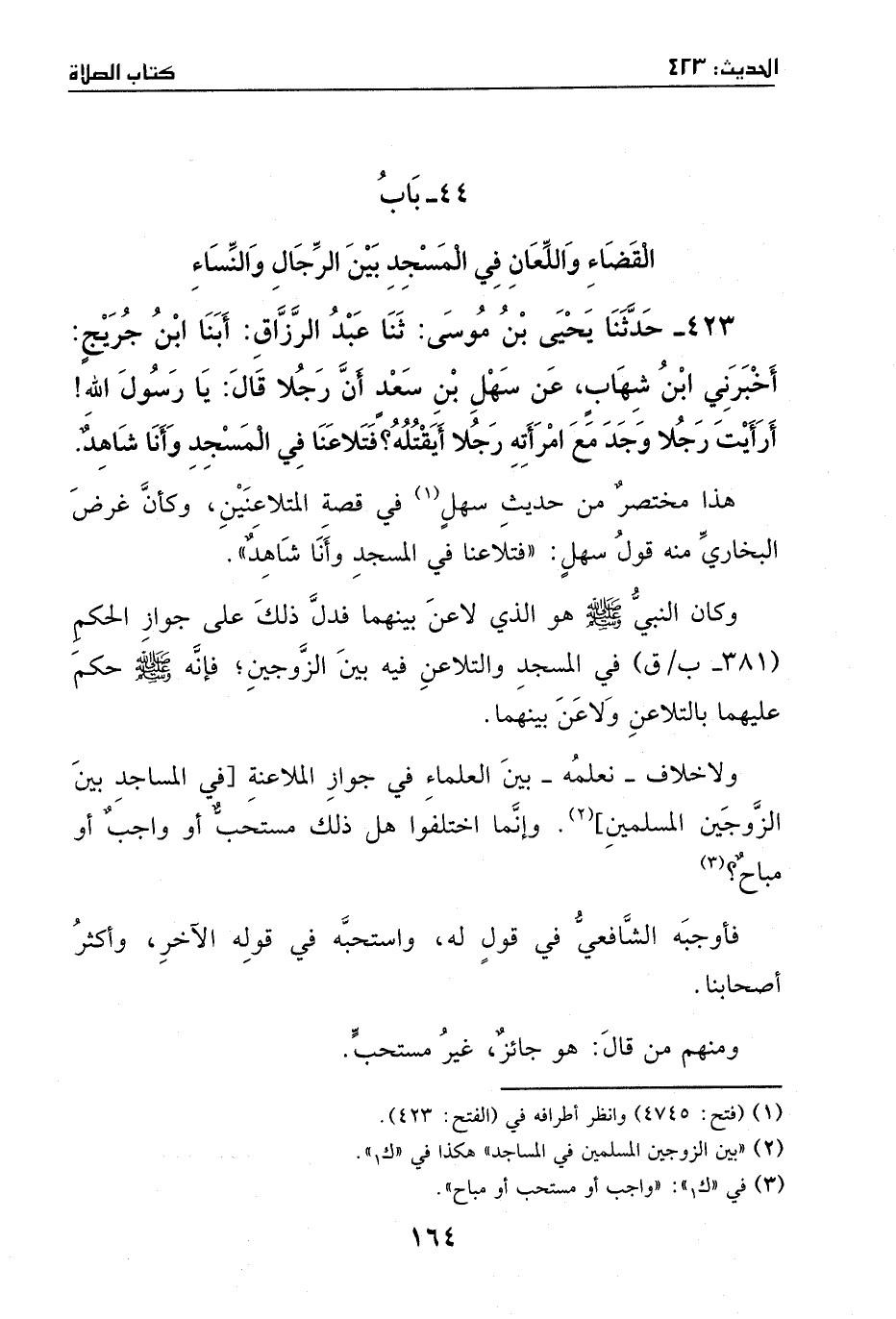 423 - حدثنا يحيى بن موسى: ثنا عبد الرزاق: ابنا ابن جريج: أخبرني ابن شهاب، عن سهل بن سعد، أن رجلا قال: يا رسول الله، أرأيت رجلا وجد مع امرأته رجلا أيقتله؟ فتلاعنا في المسجد وأنا شاهد.