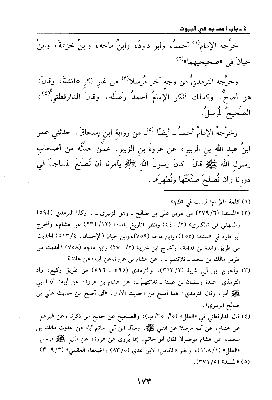 وخرجه الإمام أحمد - أيضا - من رواية ابن إسحاق: حدثني عمر بن عبد الله بن الزبير، عن عروة بن الزبير، عمن حدثه من أصحاب رسول الله - صَلَّى اللهُ عَلَيْهِ وَسَلَّمَ -، قال: كان رسول الله - صَلَّى اللهُ عَلَيْهِ وَسَلَّمَ - يأمرنا أن نصنع المساجد في دورنا، وان نصلح صنعتها ونطهرها.