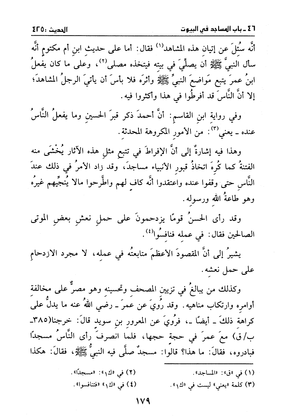 أنه سئل عن إتيان هذه المساجد؟ فقال: أما على حديث ابن أم مكتوم: أنه سأل النبي - صَلَّى اللهُ عَلَيْهِ وَسَلَّمَ - أن يصلي في بيته فيتخذه مصلى، وعلى ما كان يفعل ابن عمر يتبع مواضع النبي - صَلَّى اللهُ عَلَيْهِ وَسَلَّمَ - وأثره، فلا بأس أن يأتي الرجل المشاهد، إلا أن الناس قد أفرطوا في هذا، وأكثروا فيه.