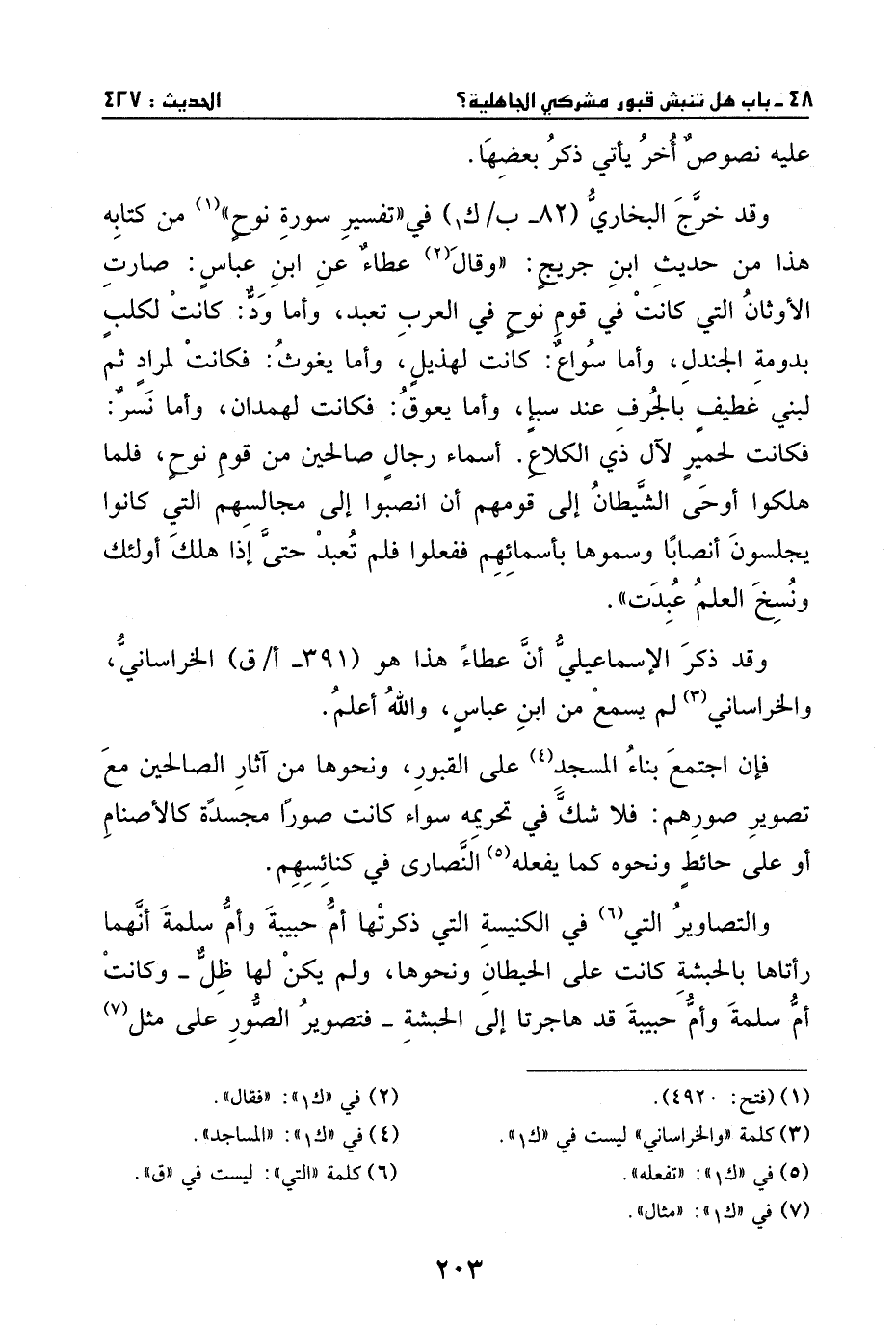 وقد خرج البخاري في ((تفسير سورة نوح)) من ((كتابه)) هذا من حديث ابن جريج، فقال: عطاء، عن ابن عباس: صارت الأوثان التي كانت في قوم نوح في العرب تعبد، أما ود كانت لكلب بدومة الجندل، وأما سواع كانت لهذيل، وأما يغوث فكانت لمراد، ثم لبني غطيف بالجرف عند سبإ وأما يعوق فكانت لهمدان، وأما نسر فكانت لحمير لآل ذي الكلاع -: أسماء رجال صالحين من قوم نوح، فلما هلكوا أوحى الشيطان إلى قومهم أن انصبوا إلى مجالسهم التي كانوا يجلسون أنصابا، وسموها بأسمائهم، ففعلوا فلم تعبد، حتى إذا هلك أولئك ونسخ العلم عبدت.