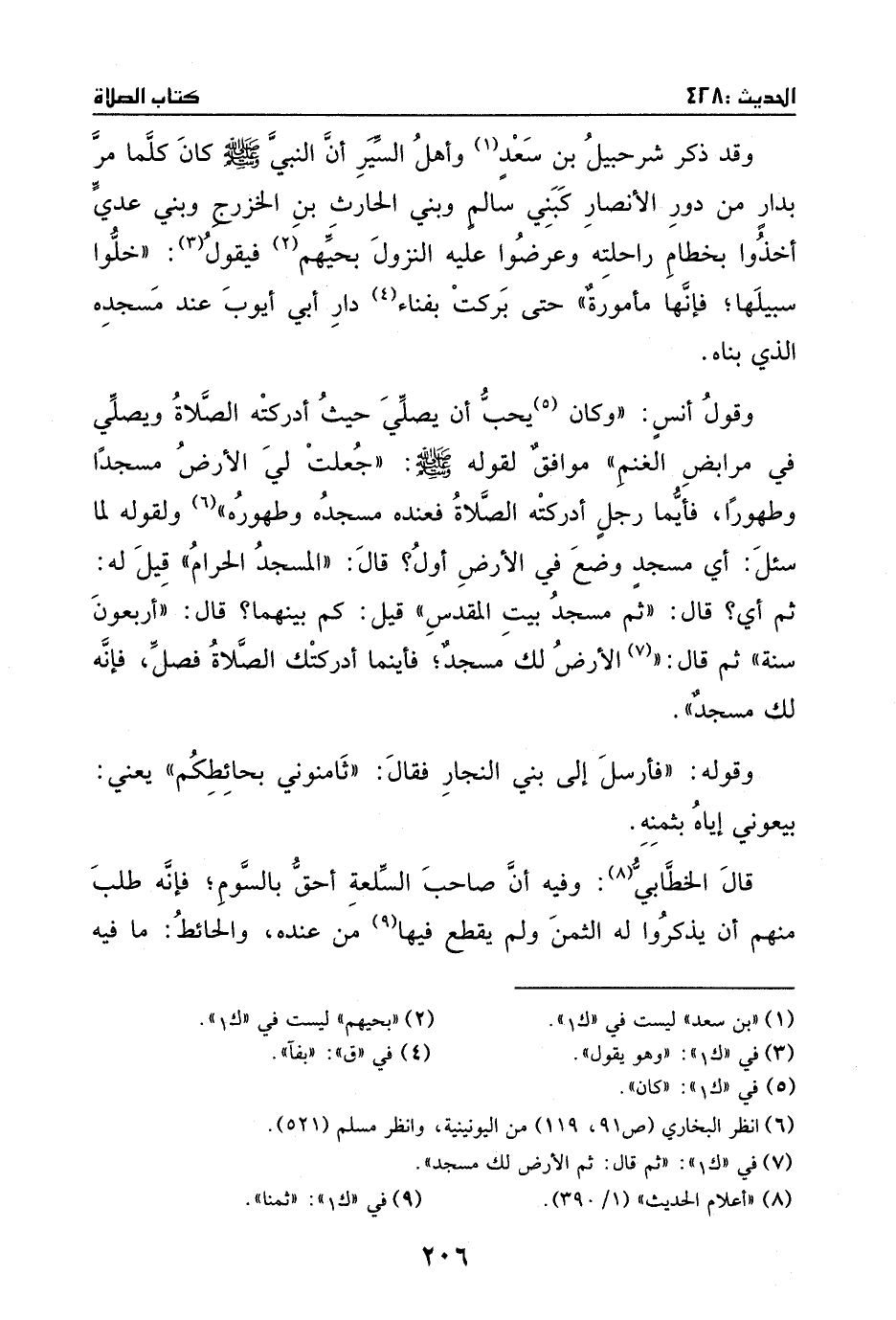 وقد ذكر شرحبيل بن سعد وأهل السير: أن النبي - صَلَّى اللهُ عَلَيْهِ وَسَلَّمَ - كان كلما مر بدار من دور الأنصار كبني سالم وبني حارث بن الخزرج وبني عدي أخذوا بخطام راحلته، وعرضوا عليه النزول بحيهم، وهو يقول: ((خلوا سبيلها؛ فإنها مأمورة)) ، حتى بركت بفناء دار أبي أيوب، عند مسجده الذي بناه.