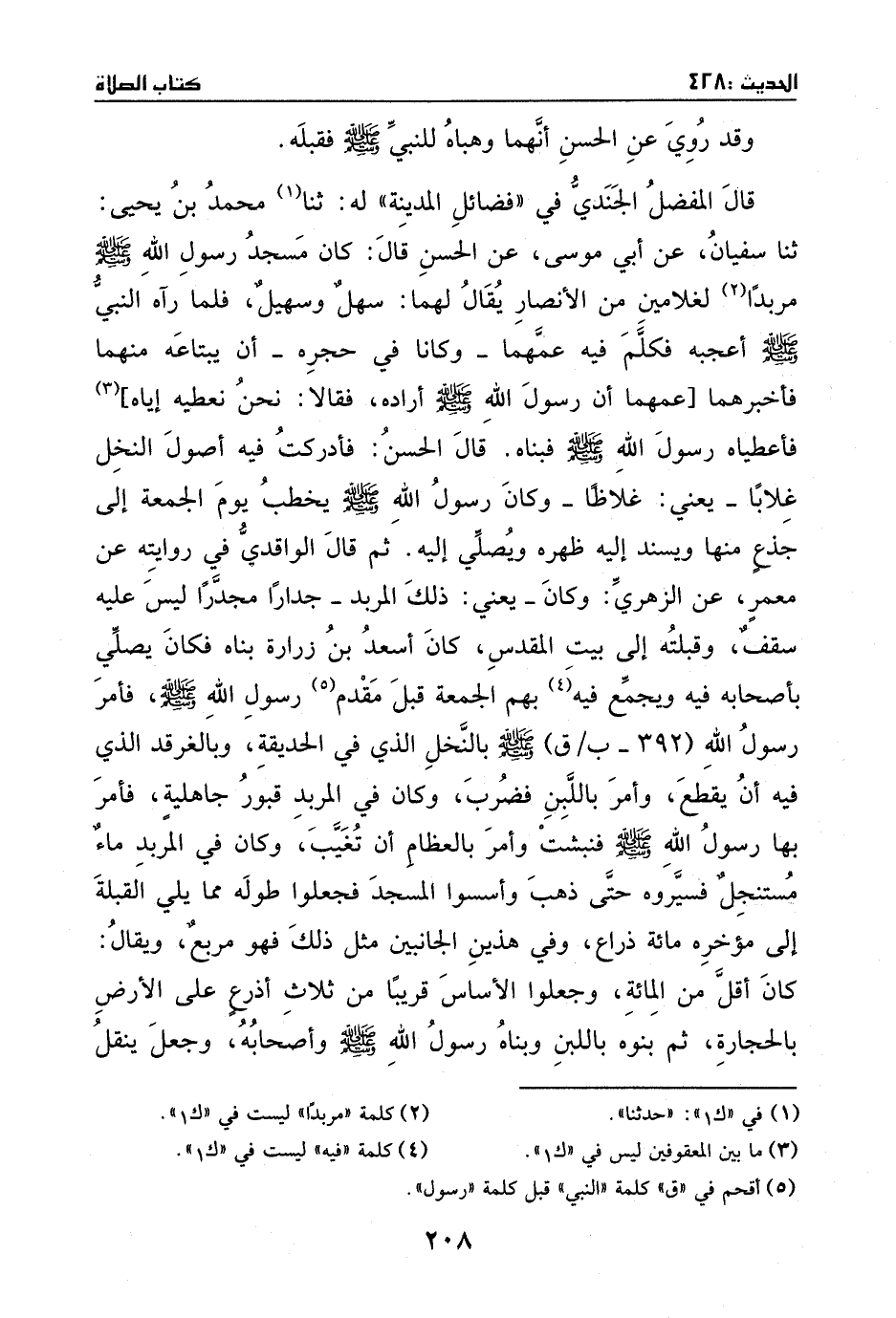 ثم قال الواقدي - في روايته عن معمر، عن الزهري -: كان - يعني: ذلك المربد - جدارا مجدرا، ليس عليه سقف، وقبلته إلى بيت المقدس، كان أسعد بن زرارة بناه، فكان يصلي بأصحابه فيه، ويجمع فيه بهم الجمعة قبل مقدم رسول الله - صَلَّى اللهُ عَلَيْهِ وَسَلَّمَ -، فأمر رسول الله - صَلَّى اللهُ عَلَيْهِ وَسَلَّمَ - بالنخل الذي في الحديقة، وبالغرقد الذي فيه أن يقطع، وأمر باللبن فضرب، وكان في المربد قبور جاهلية، فأمر بها رسول الله - صَلَّى اللهُ عَلَيْهِ وَسَلَّمَ - فنبشت، وأمر بالعظام أن تغيب، وكان في المربد ماء مستنجل فسيروه حتى ذهب، وأسسوا المسجد، فجعلوا طوله مما يلي القبلة إلى مؤخره مائة ذراع، وفي هذين الجانبين مثل ذلك، فهو مربع - ويقال: كان اقل من المائة -، وجعلوا الأساس قريبا من ثلاث أذرع على الأرض بالحجارة، ثم بنوه باللبن، وبناه رسول الله - صَلَّى اللهُ عَلَيْهِ وَسَلَّمَ - وأصحابه، وجعل ينقل