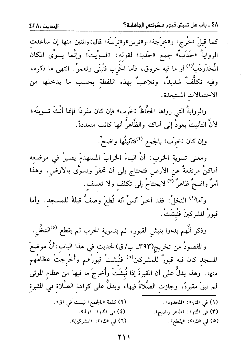 والمقصود من تخريج الحديث في هذا الباب: أن موضع المسجد كان فيه قبور للمشركين، فنبشت قبورهم، وأخرجت عظامهم منها، وهذا يدل على أن المقبرة إذا نبشت وأخرج ما فيها من عظام الموتى لم تبق مقبرة، وجازت الصلاة فيها.