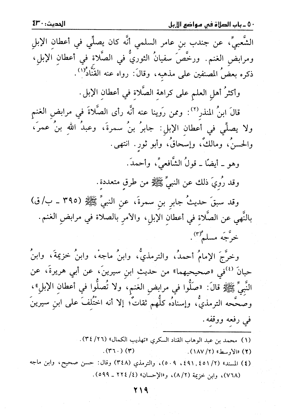 سمرة، عن النبي - صَلَّى اللهُ عَلَيْهِ وَسَلَّمَ - بالنهي عن الصلاة في أعطان الإبل، والأمر بالصلاة في مرابض