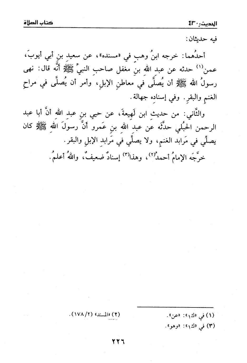 والثاني: من حديث ابن لهيعة، عن حيي بن عبد الله، أن أبا عبد الرحمان الحبلي حدثه، عن عبد الله بن عمرو، أن رسول الله - صَلَّى اللهُ عَلَيْهِ وَسَلَّمَ - كان يصلي في مرابد الغنم ولا يصلي في مرابد الإبل والبقر.
