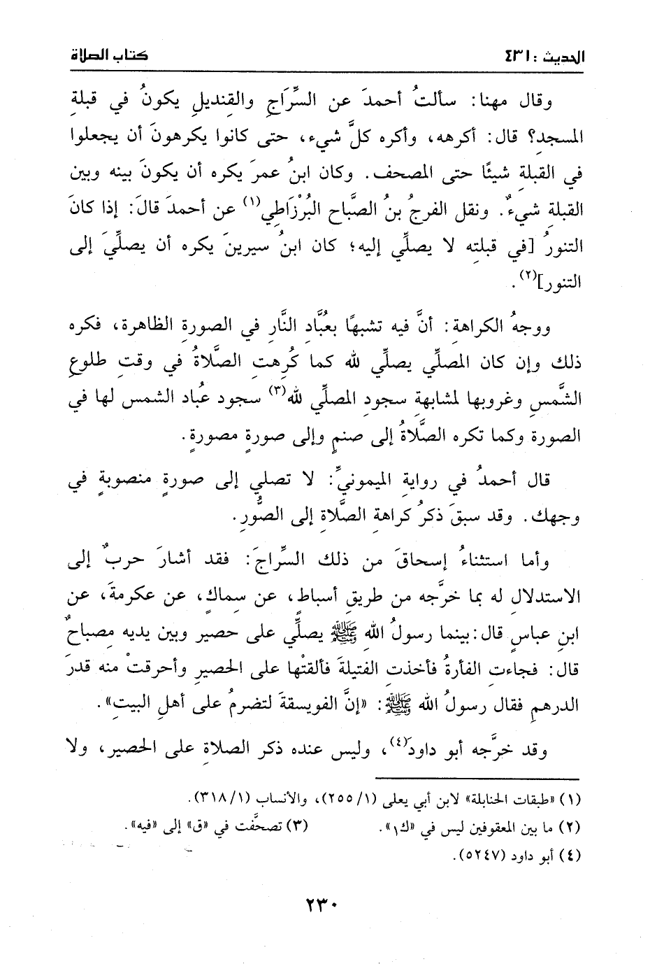 وقال مهنا: سألت أحمد عن السراج والقنديل يكون في قبلة المسجد؟ قال: أكرهه، وأكره كل شيء؛ حتى كانوا يكرهون أن يجعلوا في القبلة شيئا حتى المصحف. وكان ابن عمر يكره أن يكون بينه وبين القبلة شيء.