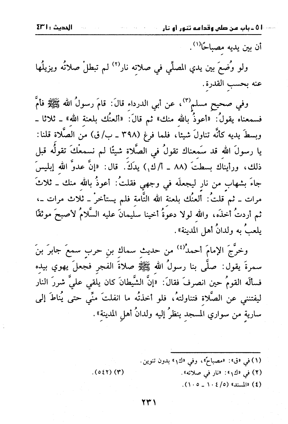 وخرج الإمام أحمد من حديث سماك بن حرب، سمع جابر بن سمرة يقول: صلى بنا رسول الله - صَلَّى اللهُ عَلَيْهِ وَسَلَّمَ - صلاة الفجر، فجعل يهوي بيده فسأله القوم حين انصرف، فقال: ((إن الشيطان كان يلقي علي شرر النار؛ ليفتنني عن الصلاة، فتناولته، فلو أخذته ما انفلت مني حتى يناط إلى سارية من سواري المسجد ينظر إليه ولدان أهل المدينة)) .