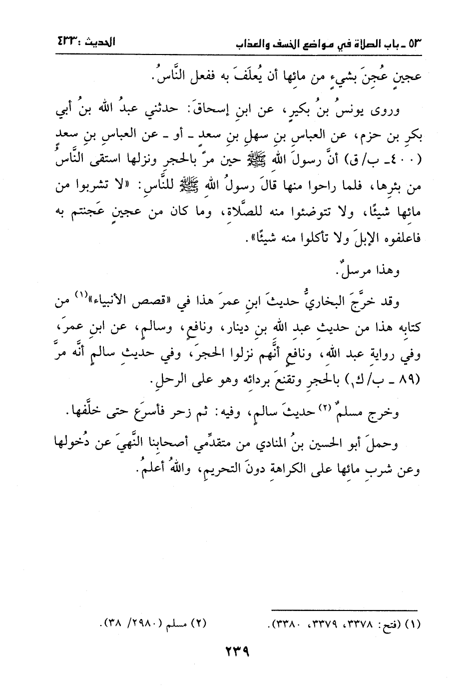 وقد خرج البخاري حديث ابن عمر هذا في ((قصص الأنبياء)) من ((كتابه)) هذا من حديث عبد الله بن دينار ونافع وسالم، عن ابن عمر. وفي رواية عبد الله ونافع: أنهم نزلوا الحجر. وفي حديث سالم: أنه مر بالحجر وتقنع بردائه، وهو على الرحل.