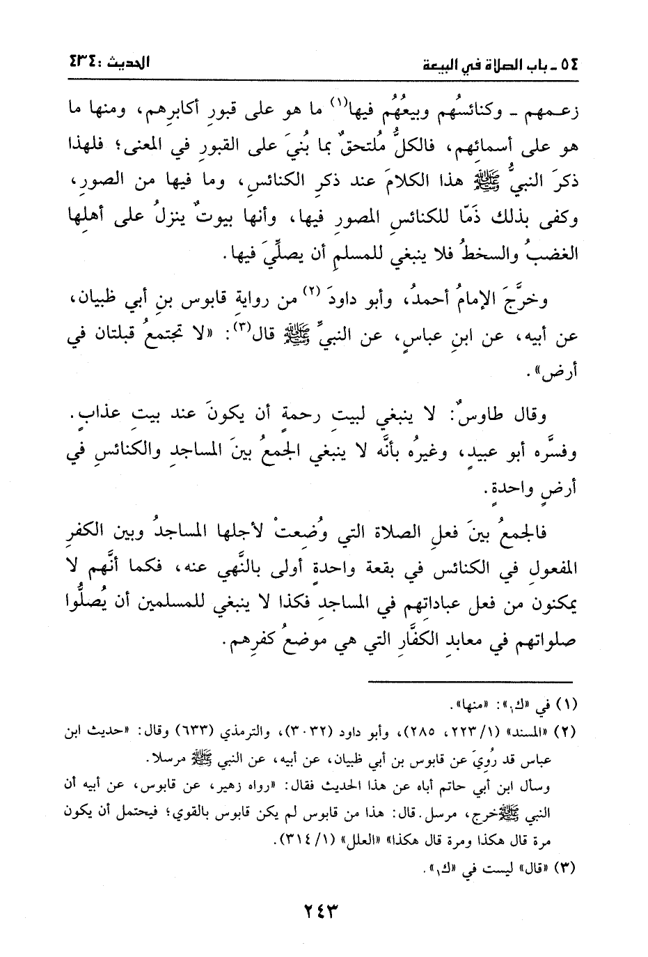 وخرج الإمام أحمد وأبو داود من رواية قابوس بن أبي ظبيان، عن أبيه، عن ابن عباس، عن النبي - صَلَّى اللهُ عَلَيْهِ وَسَلَّمَ -، قال: ((لا تجتمع قبلتان في ارض)) .